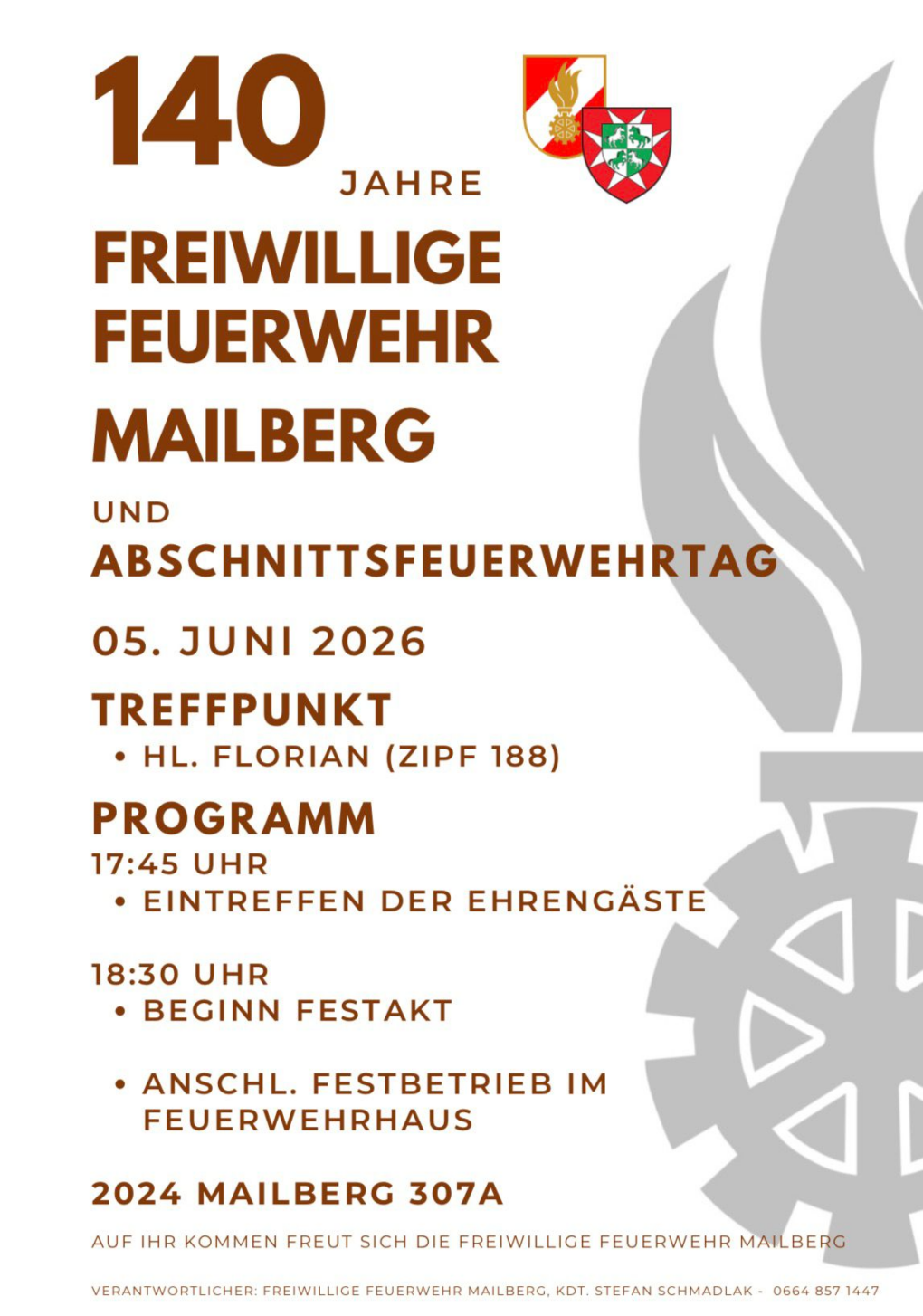Die Freiwillige Feuerwehr Mailberg lädt herzlich zur Feier ihres 140-jährigen Bestehens sowie zum diesjährigen Abschnittsfeuerwehrtag ein. Wir blicken auf über ein Jahrhundert ehrenamtliches Engagement im Dienste der Sicherheit zurück und möchten dieses besondere Jubiläum gemeinsam mit der Bevölkerung und unseren Ehrengästen feiern.